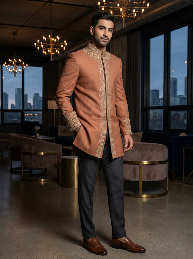 Canada’s multicultural wedding landscape—from Toronto’s bustling banquet halls to Vancouver’s oceanfront venues and Calgary’s winter ceremonies—demands sherwanis that blend South Asian heritage with practical style for diverse Punjabi, Hindu, Muslim, Gujarati, and fusion events. Grooms across Surrey, Mississauga, and Edmonton seek versatile pieces that handle chilly climates, long celebrations, and Instagram-worthy photos. This guide covers the most popular sherwani styles in Canada, tailored to local trends like neutrals for versatility and breathable fabrics for indoor-outdoor receptions.
